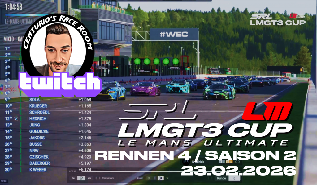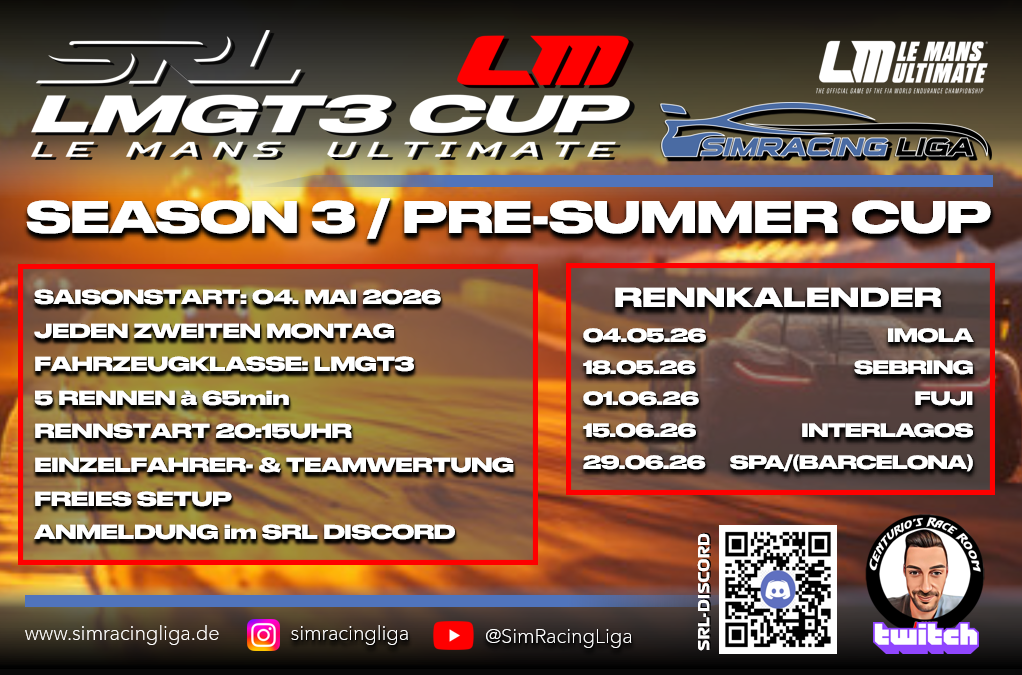 Ab sofort könnt Ihr Euch für die 3. Saison unseres LMGT3-CUP auf LeMans Ultimate anmelden. Auf dem Programm stehen jeden zweiten Montag 5 Rennen bis zur Sommerpause im Juli. Saisonstart ist am 04. Mai 2026.