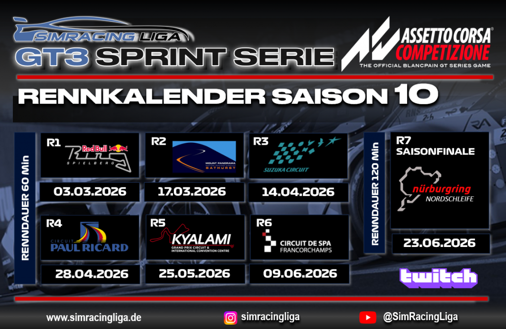 Herzlichen Glückwunsch an das Podium unserer abgeschlossenen 9. Saison der GT3-SPRINT SERIE! Eine tolle, spannende und sehr faire Meisterschaft liegt hinter uns. Aber Anfang März geht es wieder weiter auf die Rundstrecken rund um den Globus und damit in die 10. Jubiläums-Saison unserer GT3-Sprint-Serie! Freut euch auf 7 intensive Rennen auf legendären GT-Strecken rund um den Globus – und den packenden Kampf um die Fahrermeisterschaft. Die Anmeldung ist offen, sei dabei! Ob erfahrener Racer oder ambitionierter Newcomer, Bei uns zählt der faire Wettbewerb und die Begeisterung für Simracing. Auch Gaststarter sind herzlichst Willkommen! Komm jetzt ins Startgrid– wir sehen uns auf der Strecke!